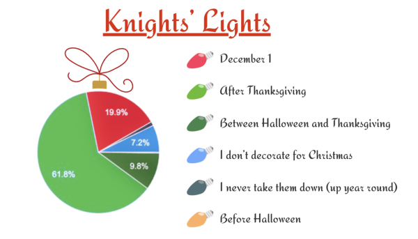 Wanting to hear the voice of my fellow youths, I surveyed when other Prospect students put up their decorations (see “KNIGHTS’ LIGHTS”). The consensus was shocking, with a meager ZERO percent saying they put them up before Halloween, out of 387 responses. If that survey is factual, then what alternate universe of Mount Prospect have I been biking in?!